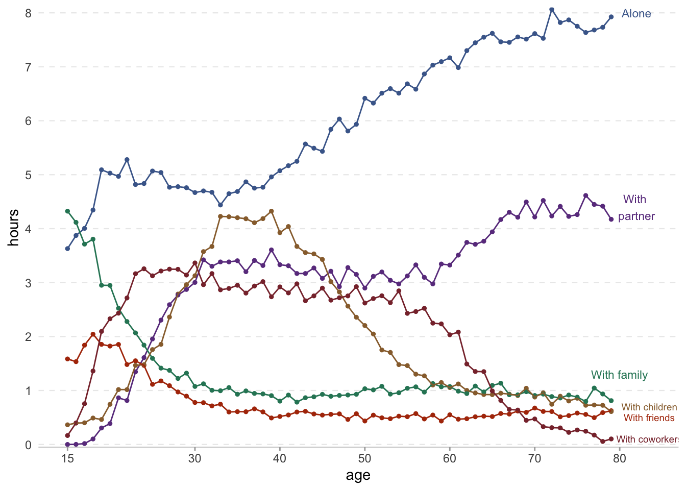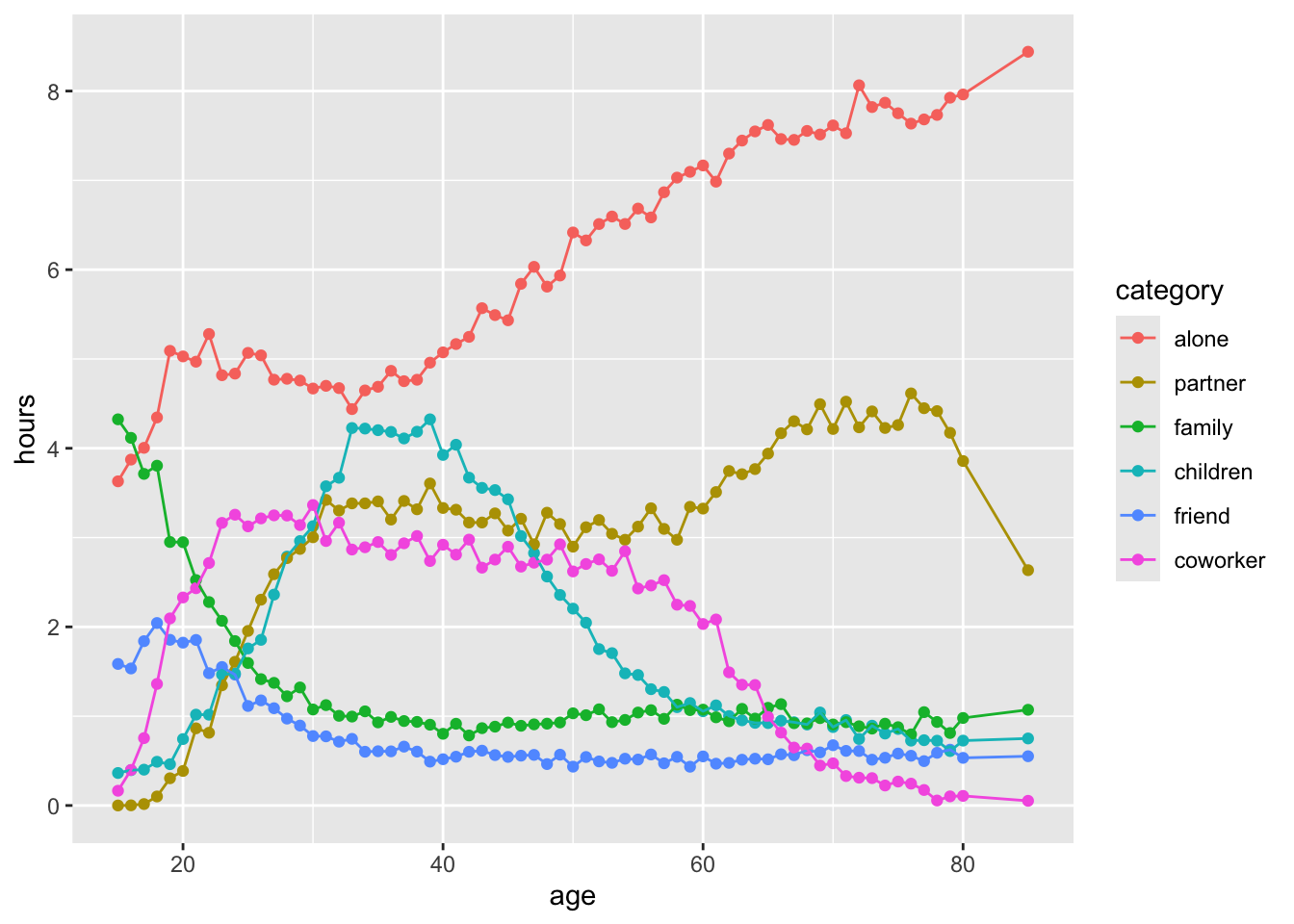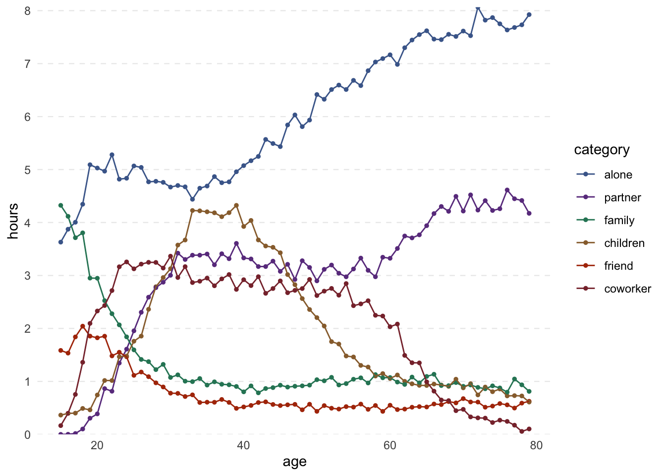 This plot from Our World in Data illustrates the amount of time that we spend with others and how that changes with age. The slope of line plotting the amount of time that people spend alone is pretty terrifying. Lets see if we can reproduce that plot using ggplot.