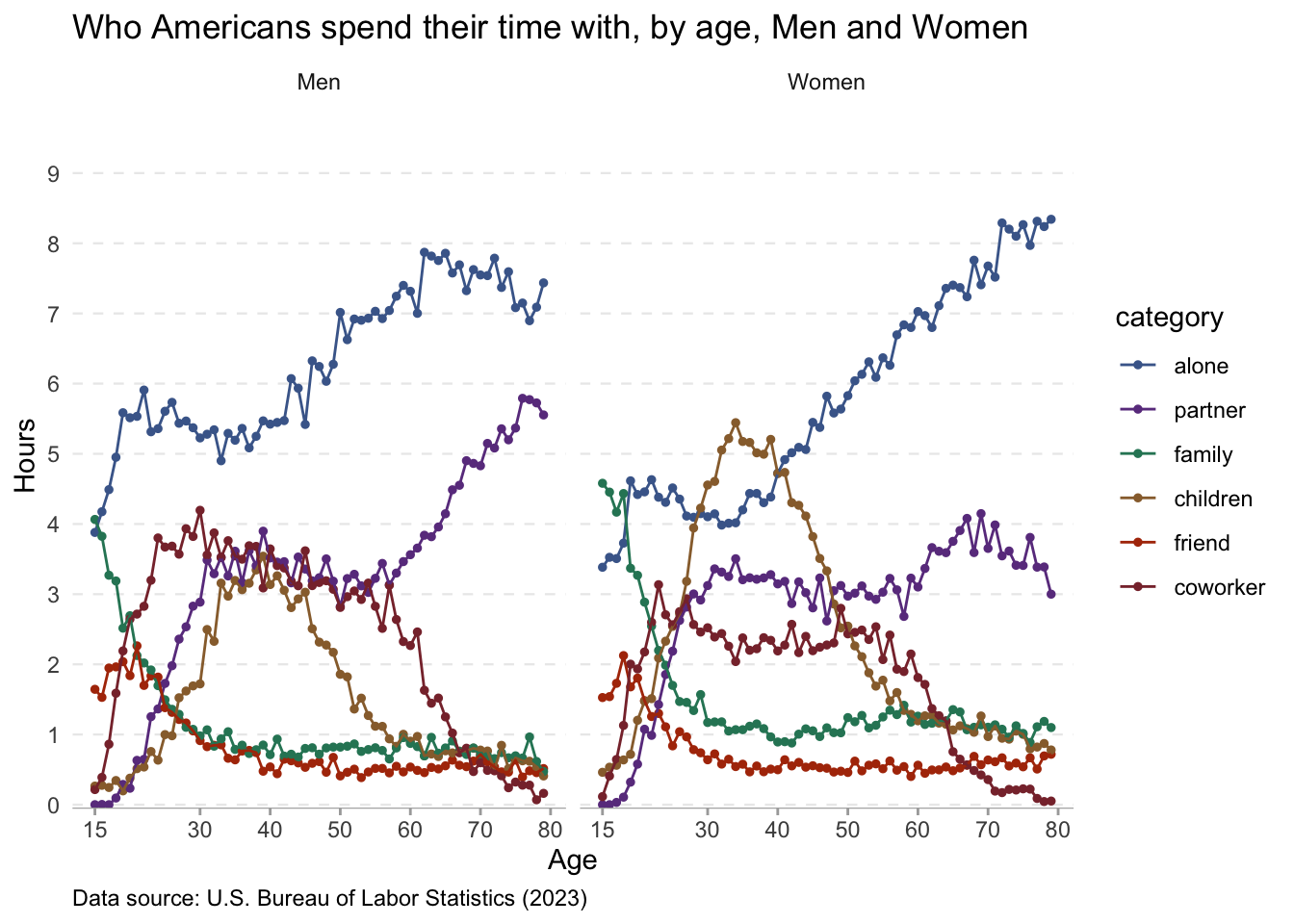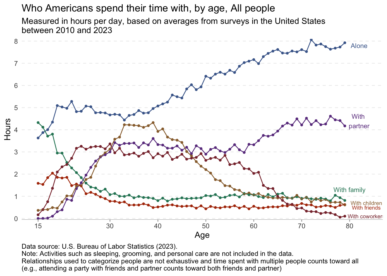 caption = "Data source: U.S. Bureau of Labor Statistics (2023). \nNote: Activities such as sleeping, grooming, and personal care are not included in the data. \nRelationships used to categorize people are not exhaustive and time spent with multiple people counts toward all \n(e.g., attending a party with friends and partner counts toward both friends and partner)") +